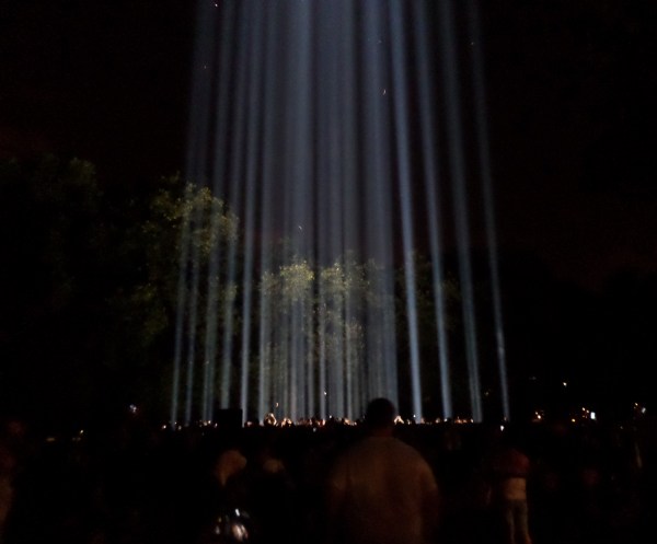 As well as taking the pictures below, I stood with my friend looking up at the lights’ effect on the sky and listening to the calm music also composed by Ikeda, soaking up the atmosphere with my fellow visitors. I saw how this memorial brought people together quietly and happily enjoying the sights and sounds. I saw smiling children being lifted up by their parents to see the tops of the lamps, and couples, friends and families gathering and sitting under the lights. This was not a gloomy atmosphere, but a peacefully respectful one.
