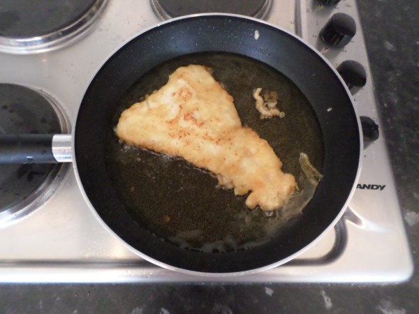 Coat the fish well in the batter before adding very carefully to a pan with hot oil (I used olive oil).