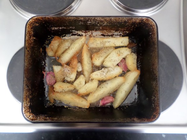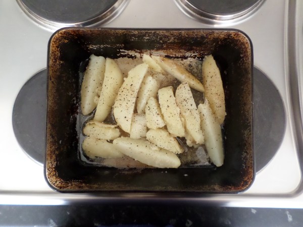 After cutting the potatoes into thick wedges, some with the skin on, I boiled them before putting them into the roasting dish with the fat, liberally seasoning with salt and pepper. But, before this, I spooned a generous amount of the fat into the roasting dish and heated this in a hot oven for 10 minutes. It’s important to make sure the fat covers the wedges so I gave them a good stir around before putting them into the oven at 200 degrees for 30 minutes.