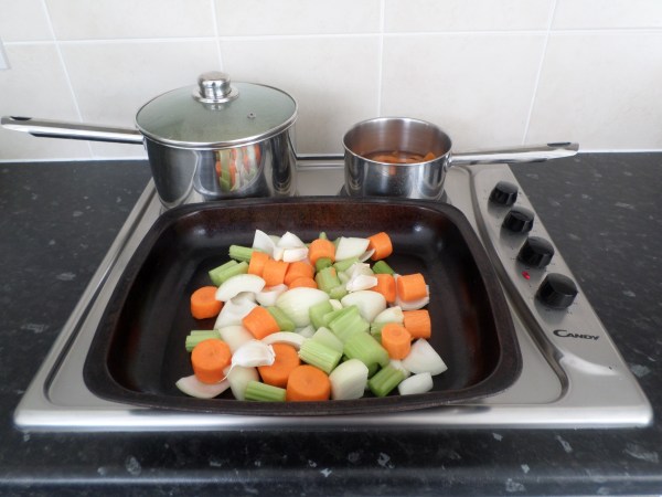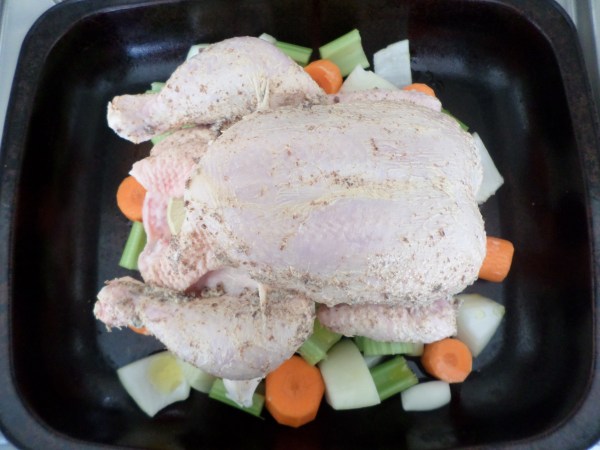 I roughly chopped up two onions, celery and carrots along with a couple of crushed cloves of garlic and put them in a roasting dish, which acts as a bed for the chicken to sit on and will also go into making the gravy.