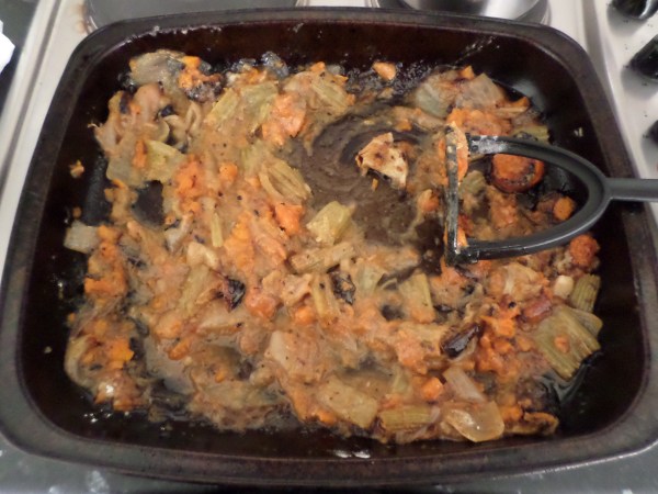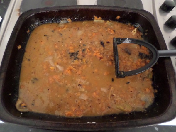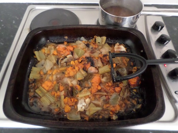 Once I lifted the chicken away, you’re left with the chicken juices, vegetables and burnt bits at the bottom of the roasting dish to make into a gravy. I grabbed a potato masher and mashed and mixed everything up. This bit doesn’t look pretty but it works.