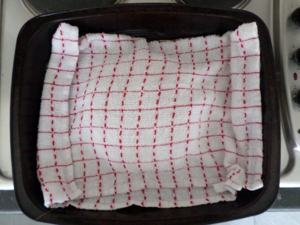 6) Cover with clean, damp towel and leave in a warm place to rise for about an hour.